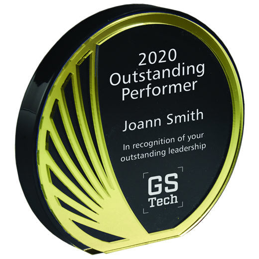 Thick clear lucite circle with black back and gold contour mirror on the front all the way to bottom. Highlight your best achievers' accomplishments with this prestigious award.