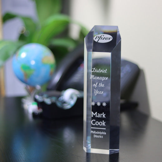 This crystal-clear acrylic award is hand-cut, machine-polished and hand-buffed to a brilliant luster. Laser engraving the reverse side of the tower for that special achievement captures meticulous detail. Enhance your Appreciation Awards by using logos and personalizations.