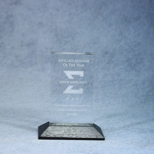 This contemporary clear acrylic rectangle is laser engraved and mounted on a traditional ebony base. This acrylic is perfect to highlight Excellence and Appreciation awards.