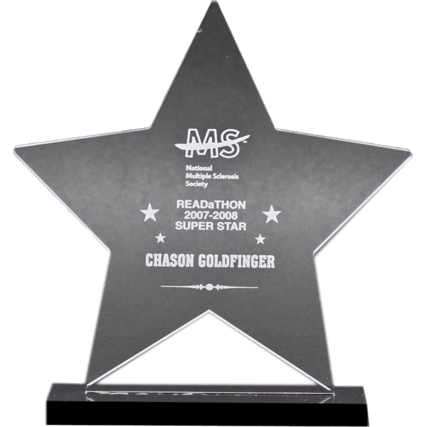 Dare to dream with this 7.5" high Acrylic Starfire Star! Customize and personalize this star-shaped, clear acrylic trophy to boldly display your accomplishments.  Let your stars shine with this laser-engraved award, or get creative with a full-color imprint. Let your vision of success take off!