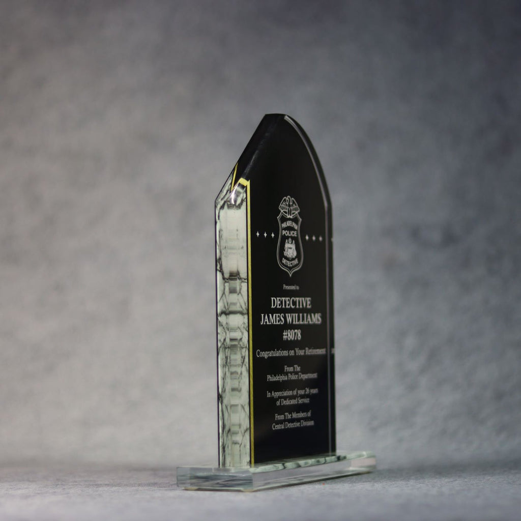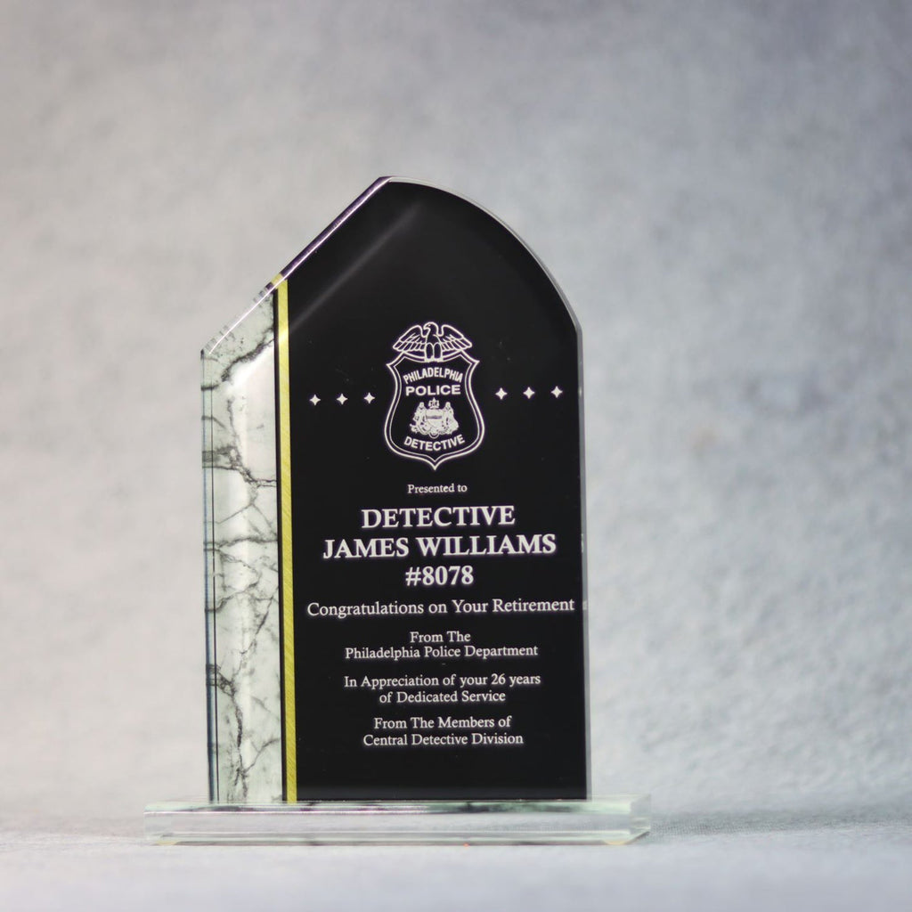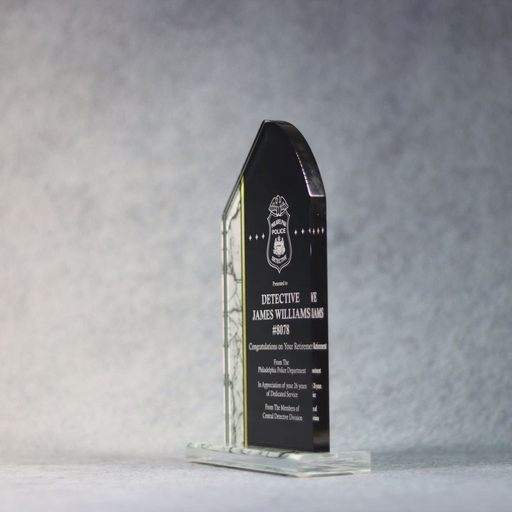 This black acrylic is stylish with a marble side and acrylic base. It will enhance your desk or credenza to showcase distinction and appreciation.