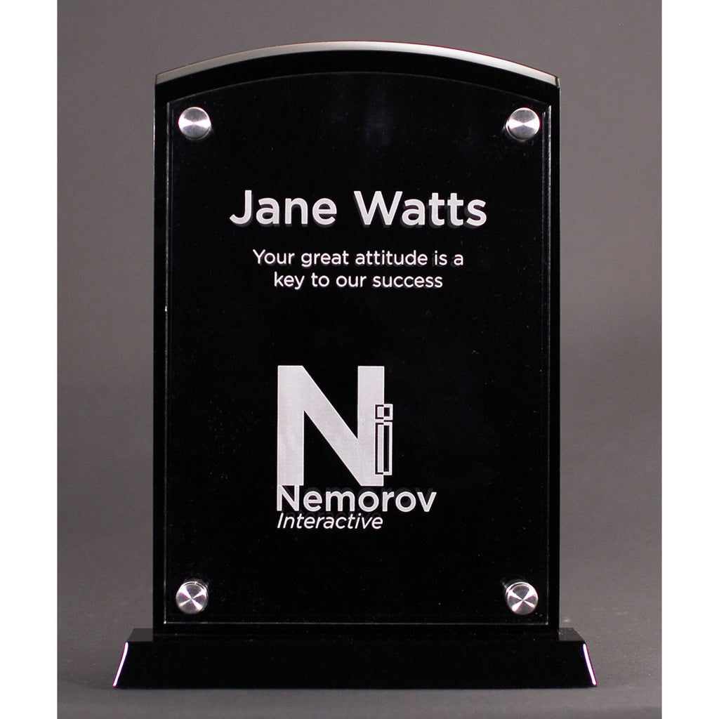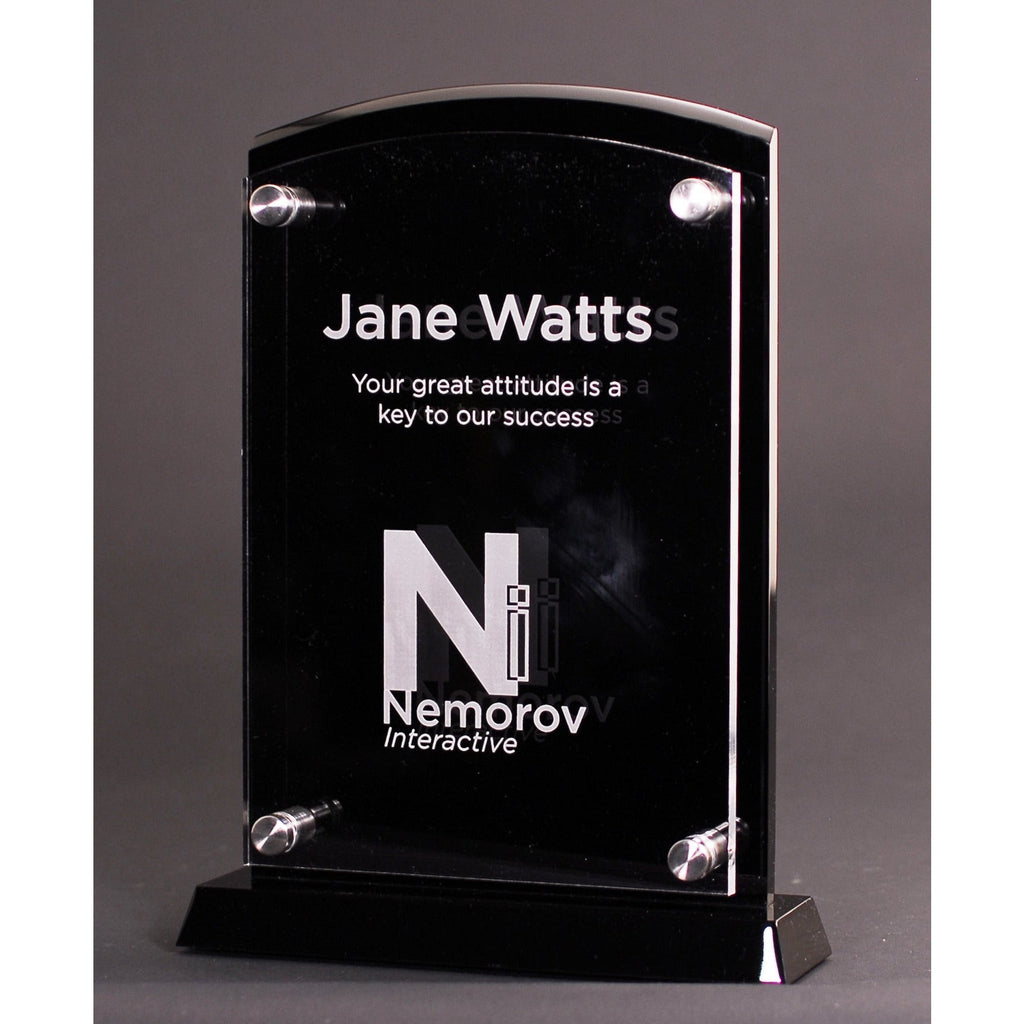This award has a clear acrylic panel offset with silver-toned hardware from a free-standing black ebony piano finish wood background creating impressive depth. Add custom text, images or logos to create a gift to honor employees, members of your organization or recognize donors to your cause. This item can be a great way to honor Employee of the Month. Create a wonderful wedding, birthday, or anniversary gift. Let us help you bring your vision to life! Available in two sizes.