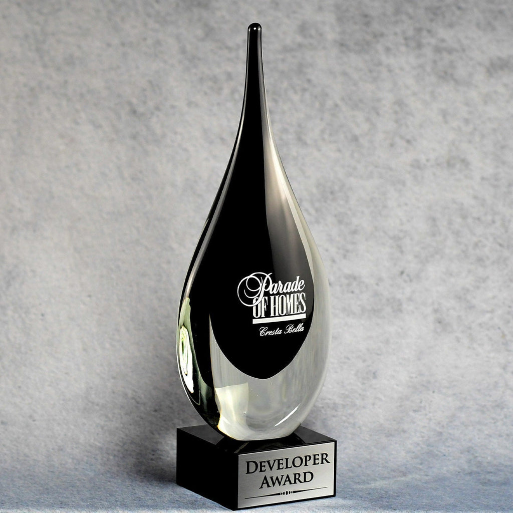 The simplicity of Black and Crystal come together to create this mysteriously prestigious design. The tear drop is attached to a black glass base (12"). Raise the stakes for that dauntless leader with added ebony base with the lustrous Piano Finish (15.5" overall). All of our art glass is hand-made to ensure that no two pieces are identical. Every award is a true "one of a kind" and bound to impress.