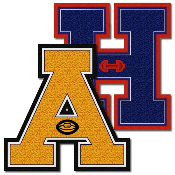 This Classic chenille-style letter can be custom designed in script names and mascots. Call our customer service representatives for details.