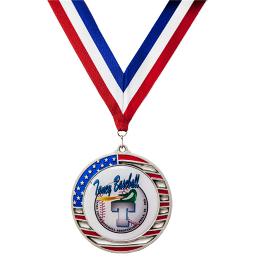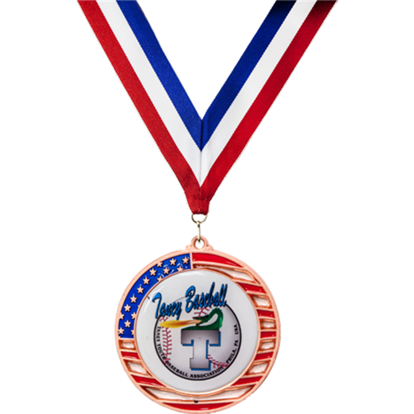 Show your patriotic spirit with this classic Stars and Stripes designed Gold Medal. This unique Medal has cool translucent stripes and can hold a 2" stock or custom Mylar insert. Add ribbon color of your choice. Medal can be lettered on the back.