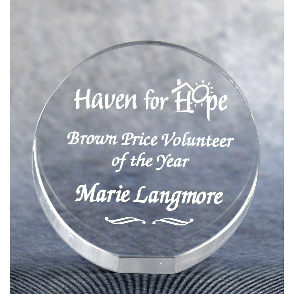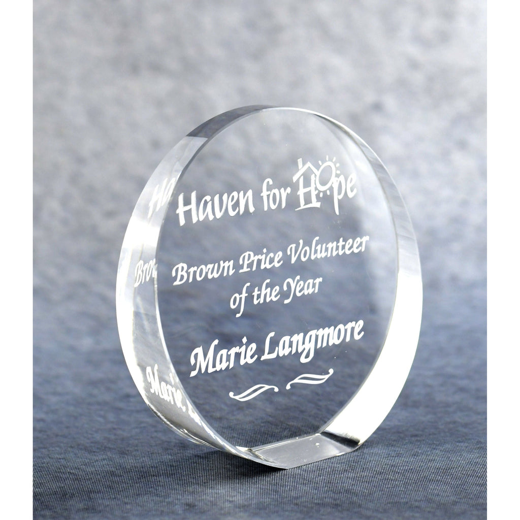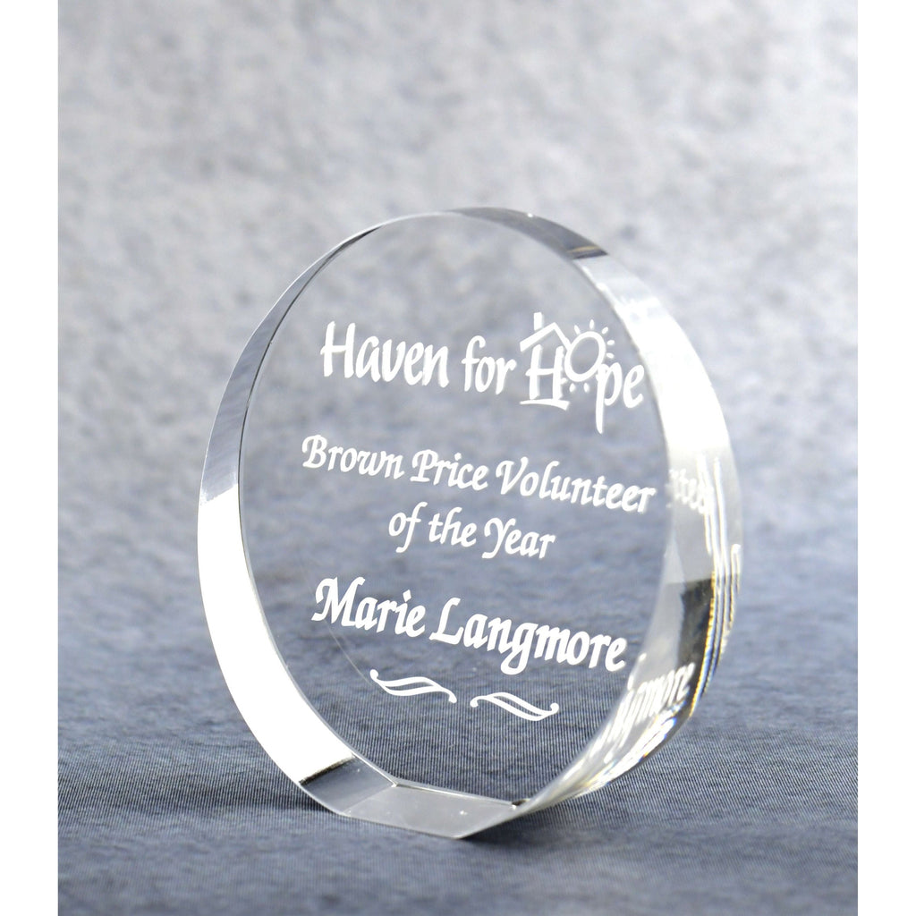 This Circular Optic Crystal Paperweight is a proven classic. The light penetrates the clear optic crystal with perfect clarity. Meanwhile, the simple circular shape represents completeness while being highly versatile for any recognition purpose. As a freestanding award, it functions equally well on a desk or shelf. It is practical as well as beautiful. Perfect for individual recognition.