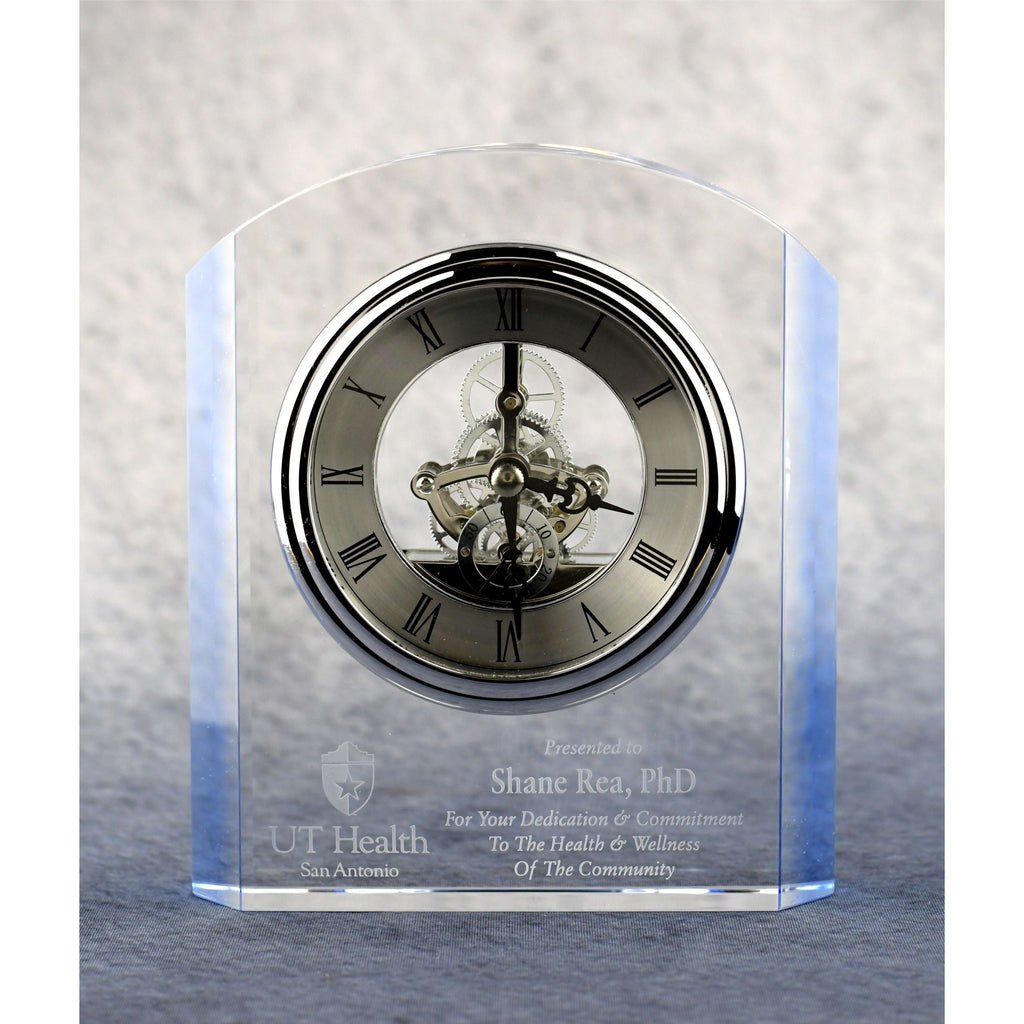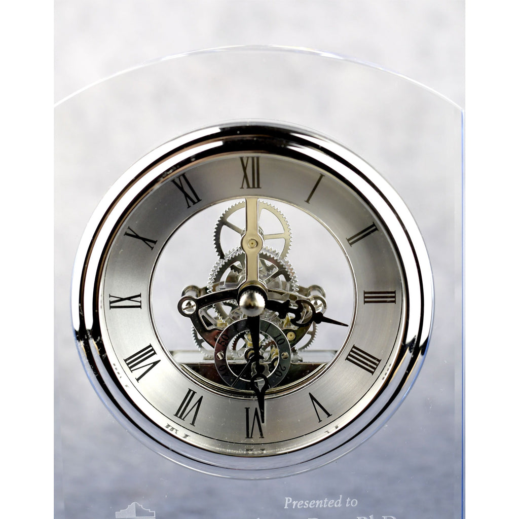 A handsome 6.75-inch, clear arch crystal clock with blue accents, silver bezel, and three-hand movement. The battery-operated clock has a silver metal dial face with black Roman numerals, black hands, and a separate dial showing seconds. The clear design shows the clock's inner gears. Personalize this Crystal Clock with your own inscription, company logo, and the individual's name. Consider adding color fill engraving.