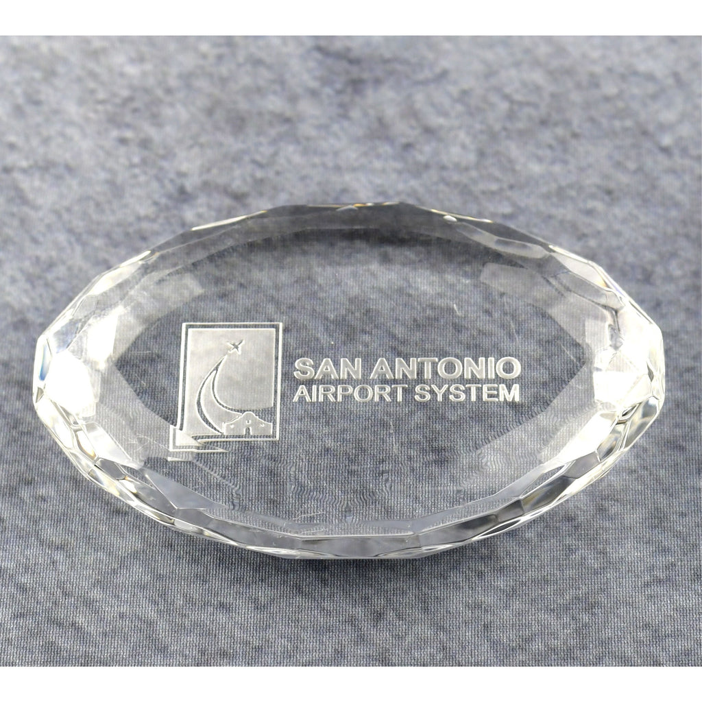 The traditional style of the Clear Crystal Oval Paperweight makes for a stunning corporate gift. The oval shape highlights multiple tiers of facets and highlights your expertly etched sentiment. The 4.5 inches provides additional room for saying all you hope to say. More than just an award, this functional paperweight will be put to use day after day on your recipient's desk.