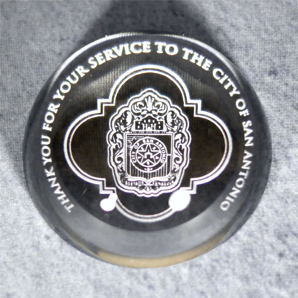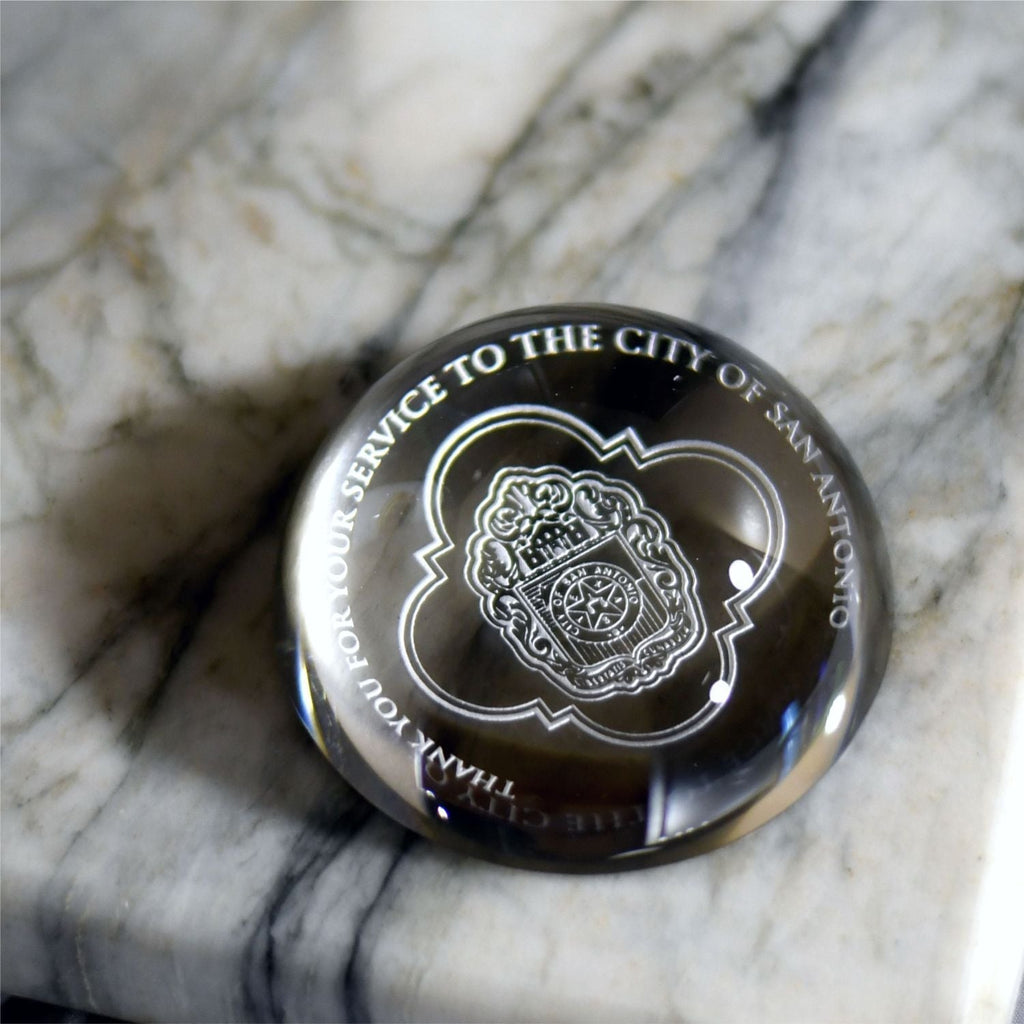 The bold, high dome creates a marvelous magnifying effect, turning your message into a wonder to behold on this Crystal Paperweight. The hefty weight of the crystal leaves no doubt about the solidity of your recognition. The tall, snow-globe dome gives the impression of a world of accomplishment. Sand etch your heartfelt words into the bottom of the 3 inch diameter piece, and it will stand out from above.