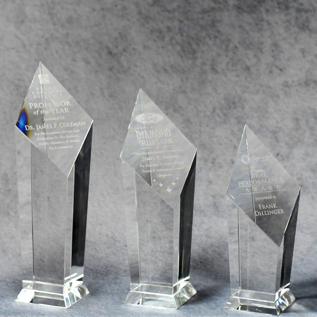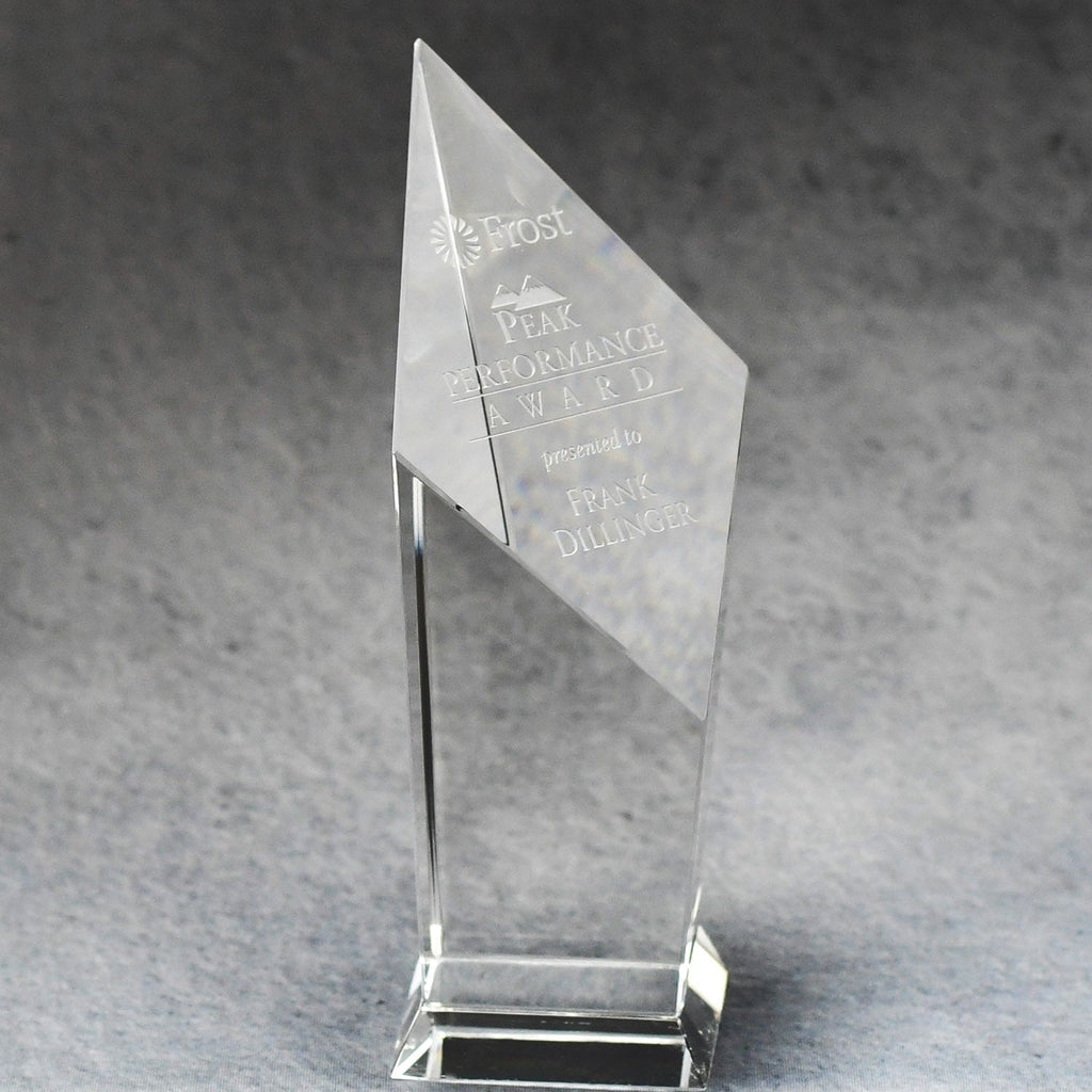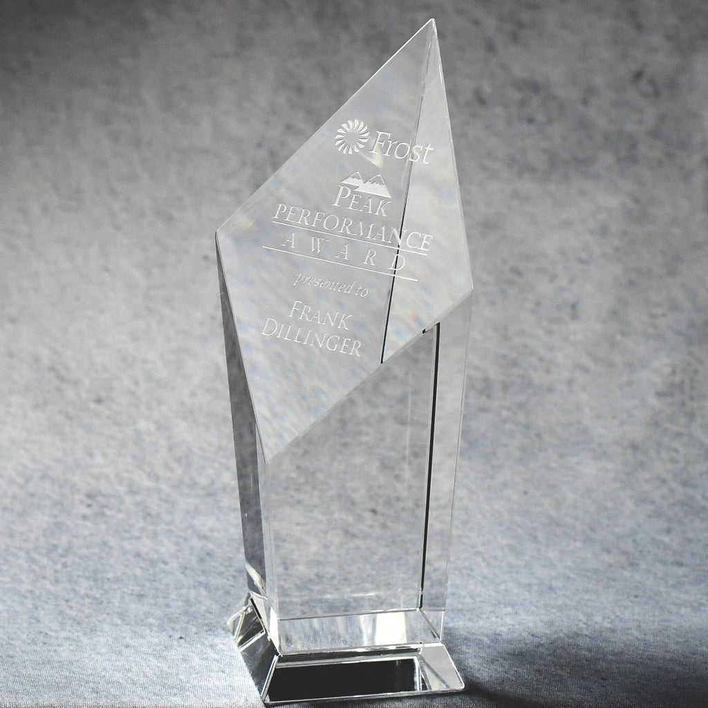 This stunning Crystal Tower Award is sure to impress! With an elegant slanted top, your logo will be brilliantly displayed. Available in 3 sizes.