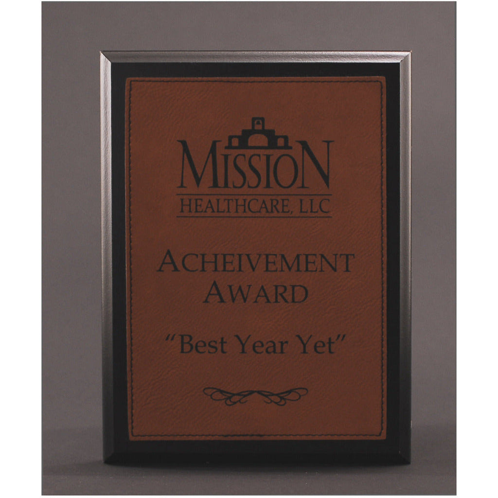 This 7x9 beautiful simulated ebony plaque with a leatherette plate is a unique design. When lasered the wording comes through a rich black for the utmost in visual impact.