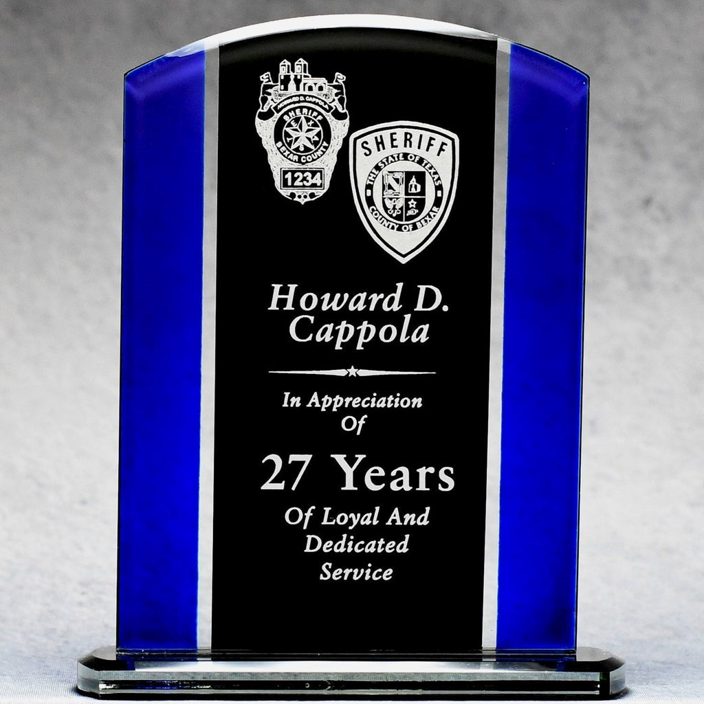 This economical standing award is made of black and blue glass panels and perfect for any office. Varying sizes make this award perfect for different levels of recognition. The center panel can be laser etched.