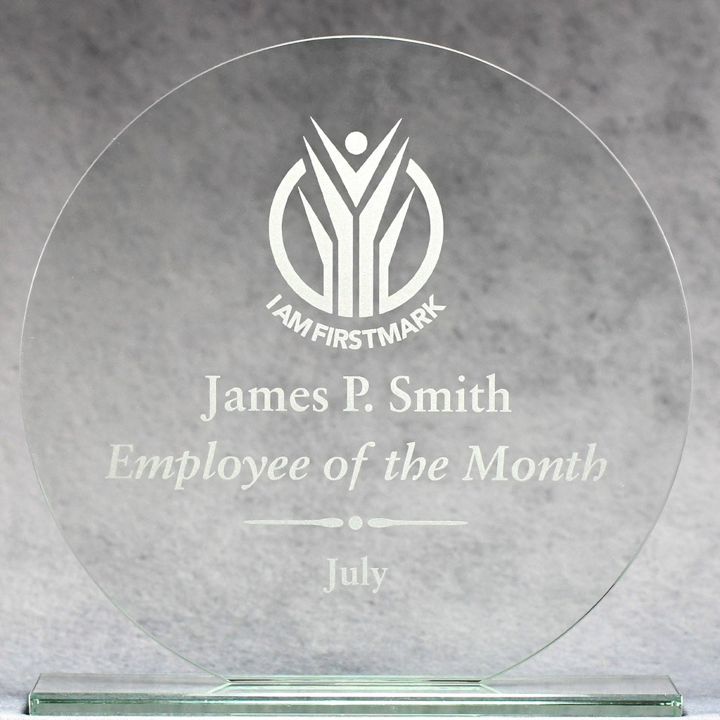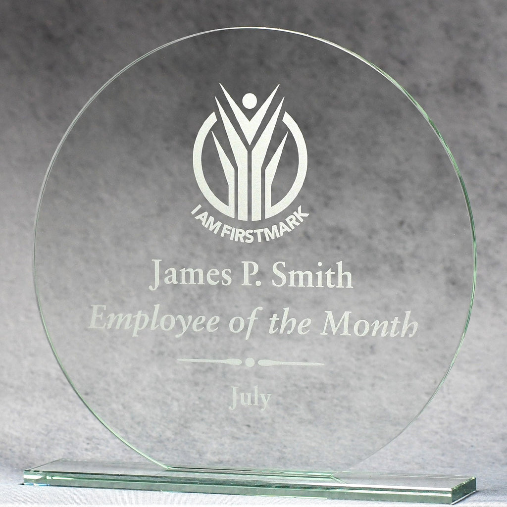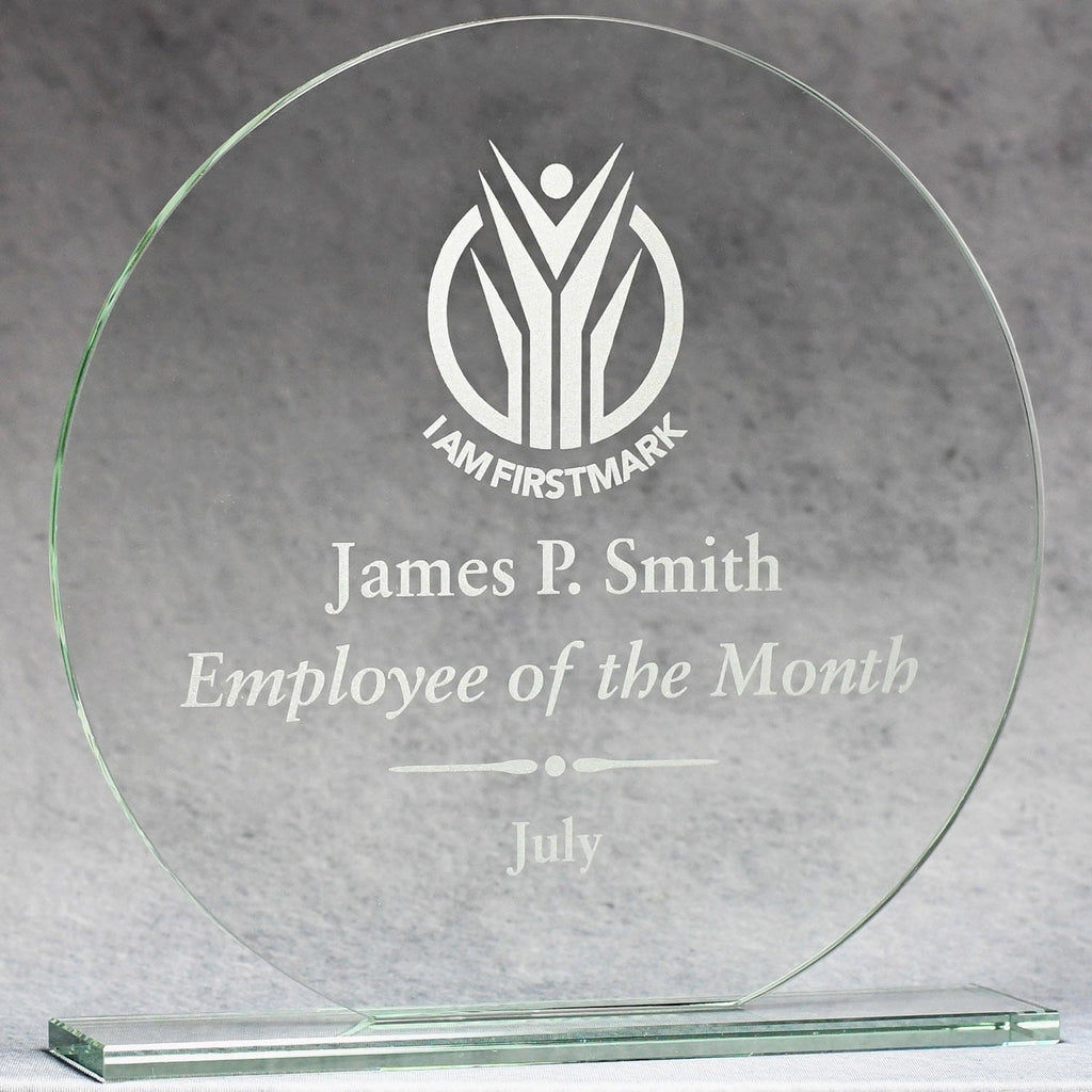 This classic shaped circular award is made of jade glass and is assembled on a matching base. Available in three sizes, this award is perfect for tiered recognition programs. The Imprint surface is large enough to hold your personalized message along with your logo. Multiple imprint methods are available on the round upright. This classy award is budget-friendly and will look great on any desk or bookshelf.