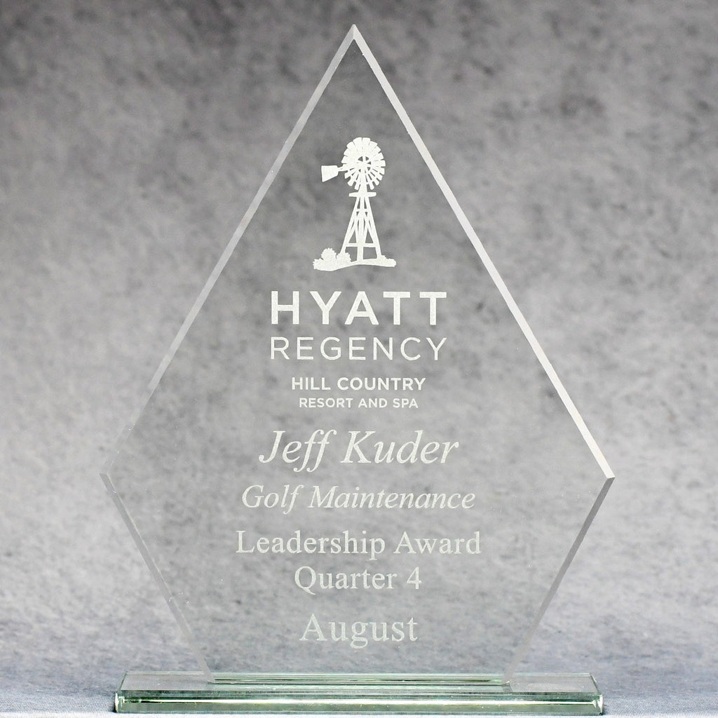 This beautiful, economical award is made of jade glass and comes on a jade glass base. Available in three sizes, it is perfect for a tiered recognition program. The diamond shape gives the appearance of sophistication. The imprint area is large enough for your personalized message and logo and the award can be imprinted digitally to enhance the visual impact. This quality product will look great on anyone's desk or bookshelf.