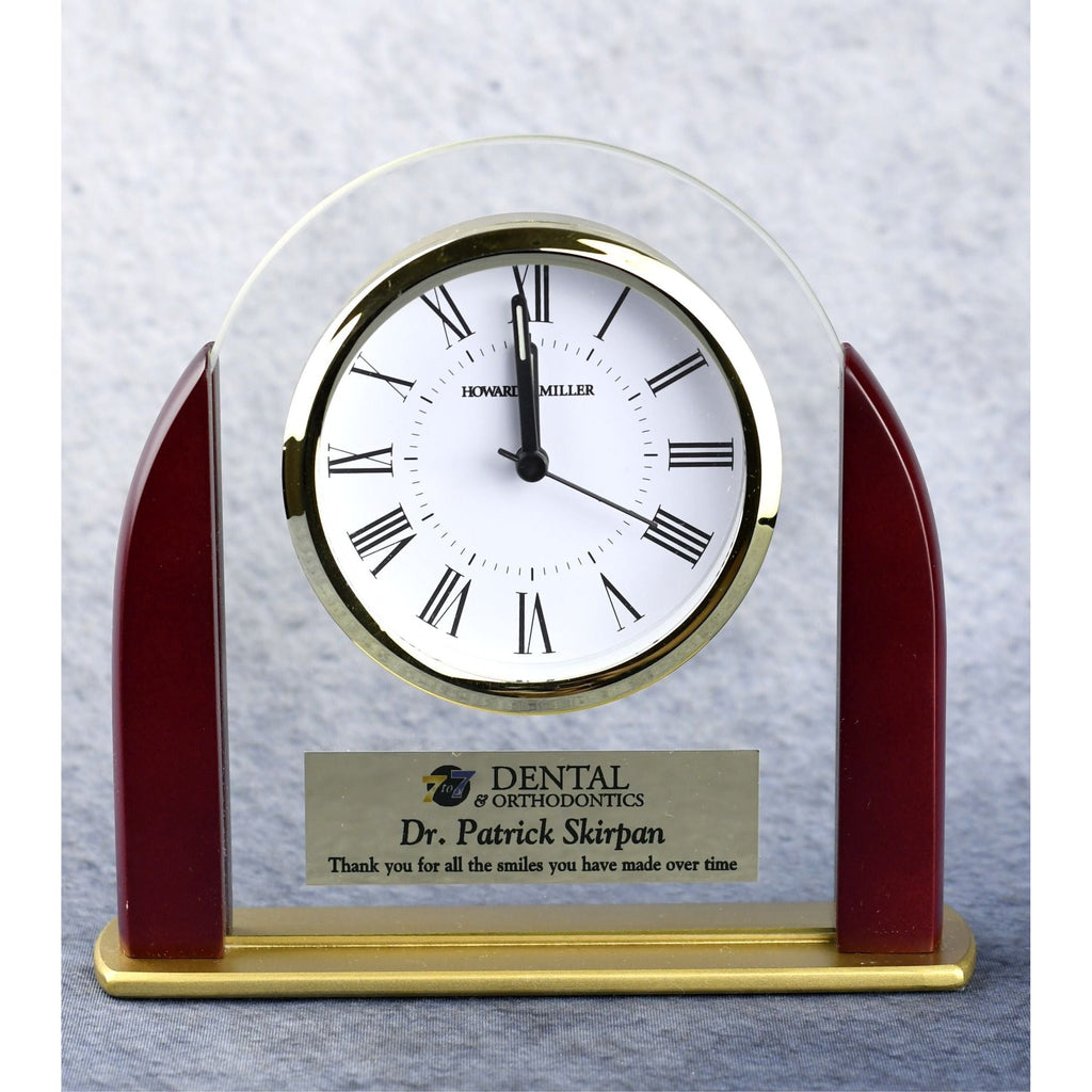 Elegant glass arched table clock framed with rosewood sides and brass base. Features a brass engravable plate to personalize with your own inscription, company logo, and recipient's name.