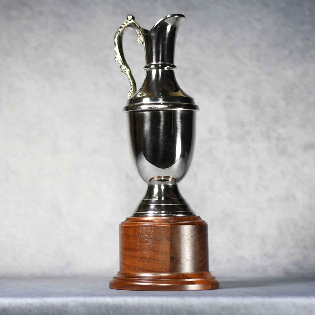 Celebrate victory with a Golf Tradition! This 14 inch tall Nickel Plate English Claret Jug on a solid walnut base is an affordable but elegant way to recognize Golf Excellence. Cherish this classic award, that will not tarnish, long after your golf event has concluded. A silver plate is provided for personalization.