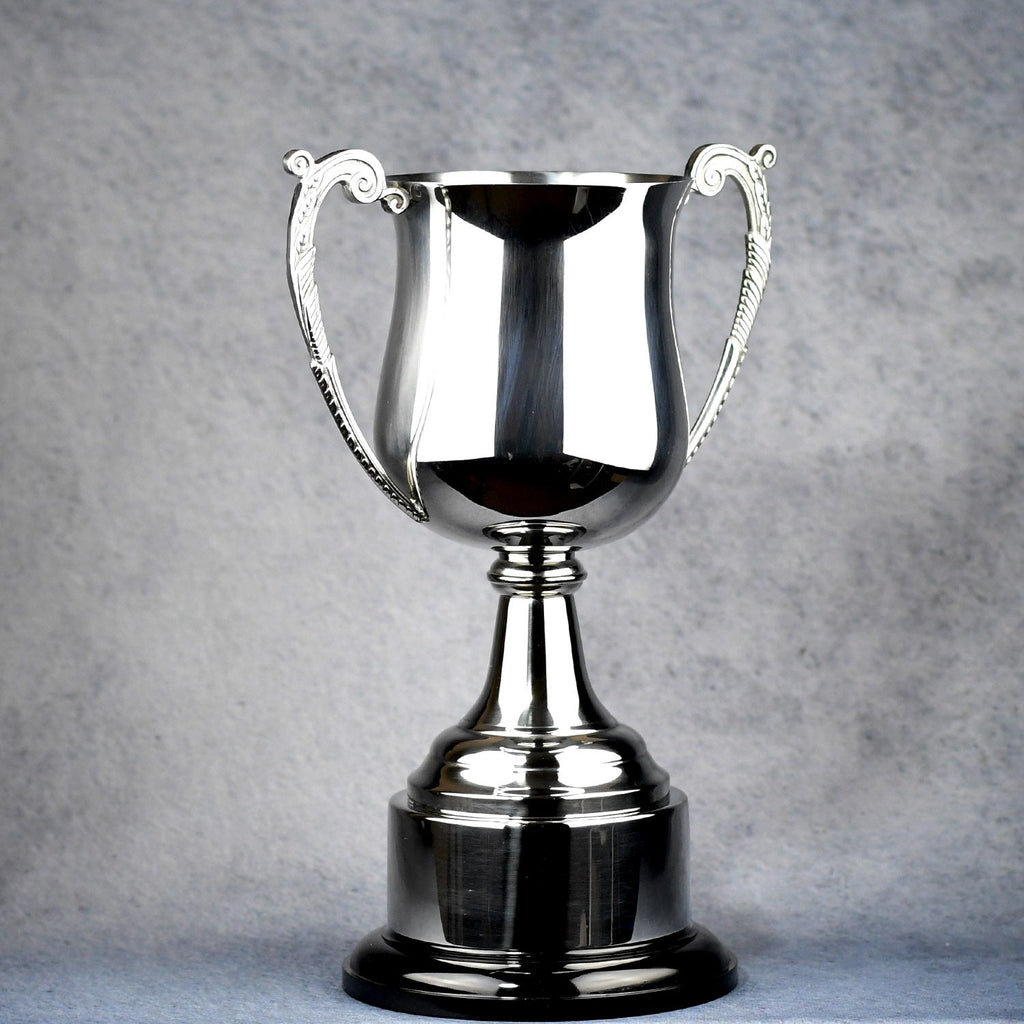 These beautiful silver metal cups are an elegant piece that looks great in any setting. The cup is mounted to a black piano finish base with a personalized plate.