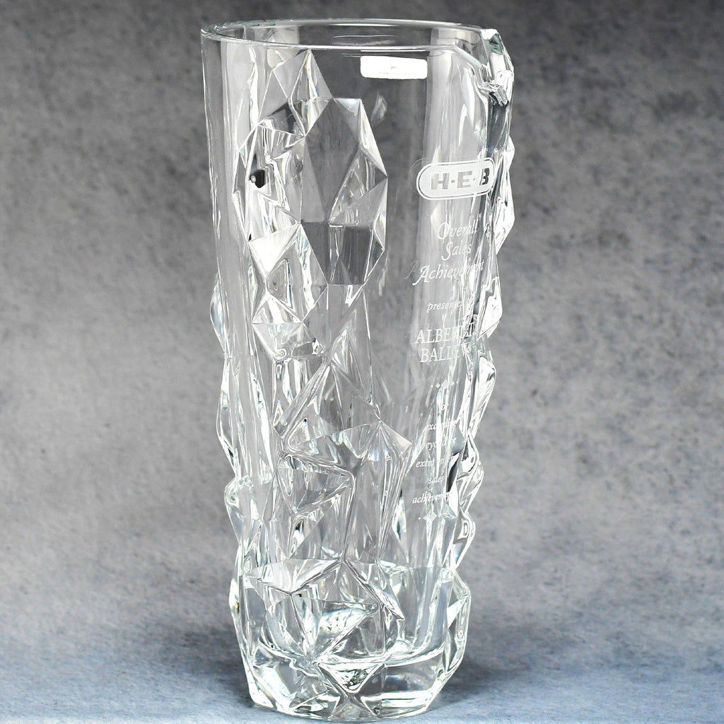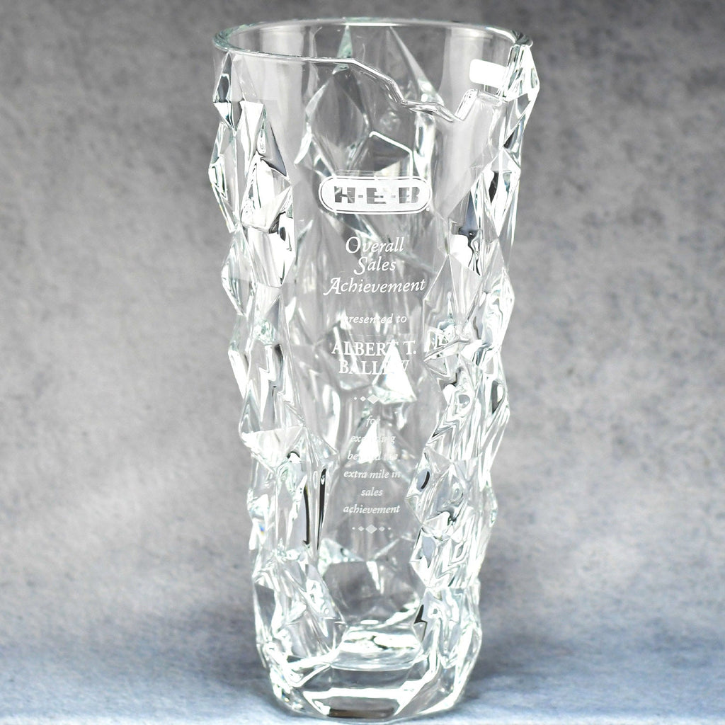 The Iceberg sculpted vase is a modern design perfect for recognizing innovative contributions to your company or event. By adding custom text, images, or a logo you can create a unique way to reward the visionaries in your organization. This distinctive item can be a memorable way to recognize a team member or employee. This vase can be presented to acknowledge a significant donation to your cause.