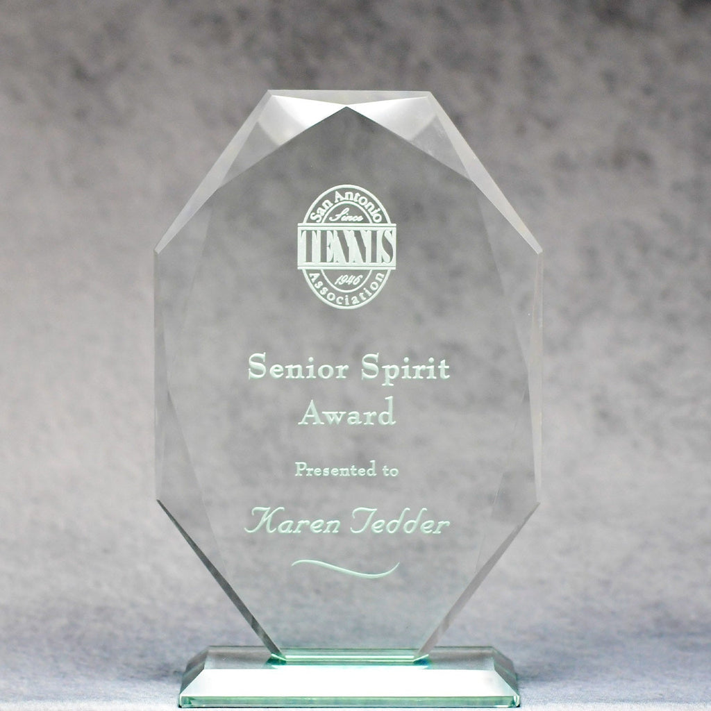 Our popular Jade Glass Multi-Faceted Elongated Octagon Award is presented handsomely on a matching beveled jade crystal base. Hand-cut beveled edges highlight each elegant piece and provide dimension and a beautiful reflection. This would make a memorable award or gift.