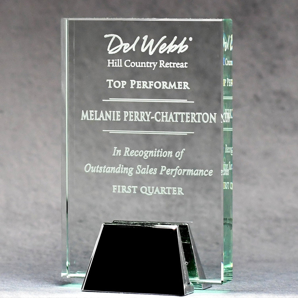 The sleek metal base securely cradles this rectangular Jade Glass. An office desk or bookcase would be an ideal setting for this unpretentious, stately award.