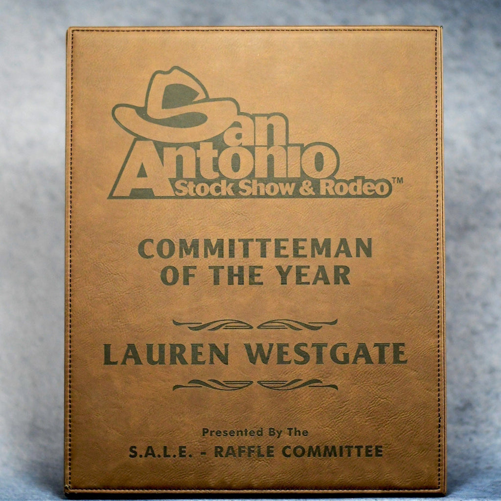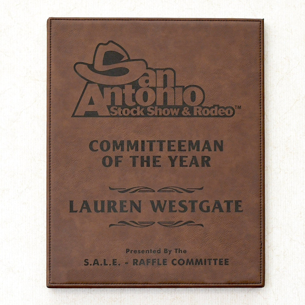 This beautiful leatherette plaque is a unique design and the leatherette material encompasses all sides including the back. When lasered the wording comes through a rich black for the utmost visual impact. Available in 4 sizes for tiered recognition programs.