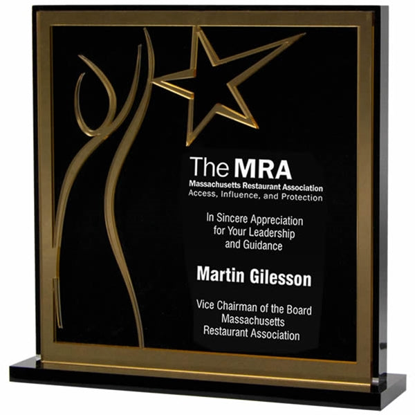 Thick, clear acrylic square accented by a star with black and gold contour mirror all the way to the bottom. Highlight your star achievers' accomplishments with this prestigious award.