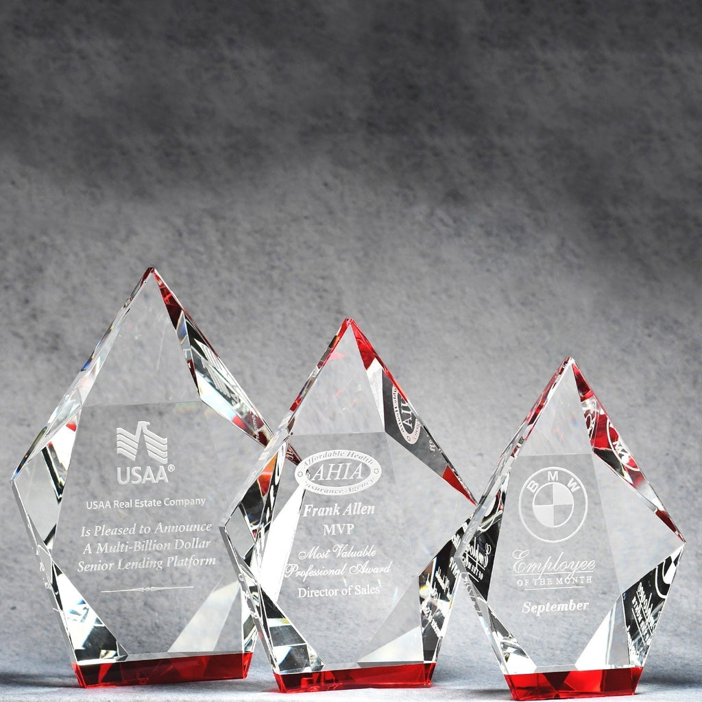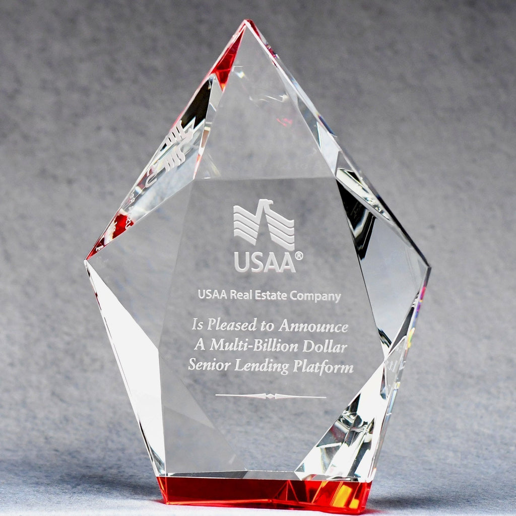 This 1.75-inch thick, clear and red, multi-faceted hexagon award is SURE to thrill your recipient! This corporate award is made of clear crystal features with a ruby red base. Available in 3 sizes.