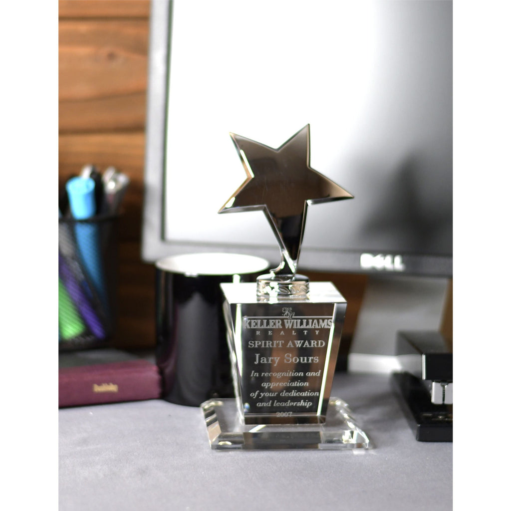 Make your recognition crystal clear with the Optic Crystal Base with Silver Metal Star. The symbolism of the classic star communicates success, while the elegance of the crystal shows you stop at nothing to recognize true merit. This piece of art is perfect for your star performer. Personalization is expertly etched into the crystal base.
