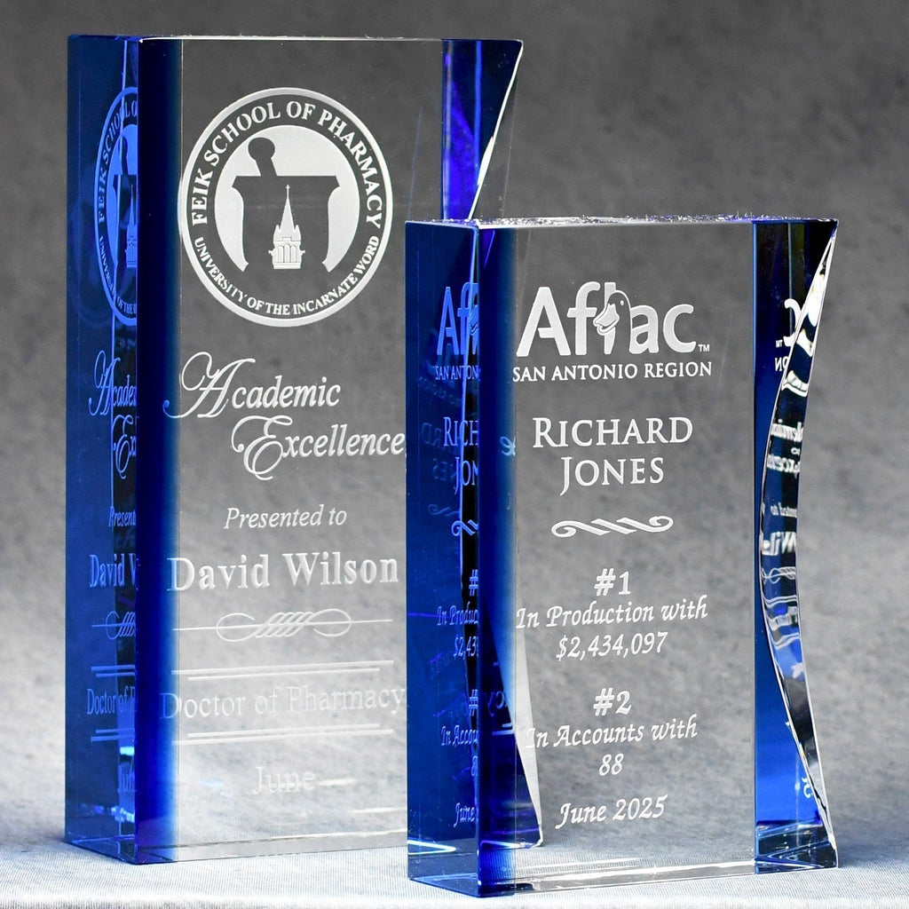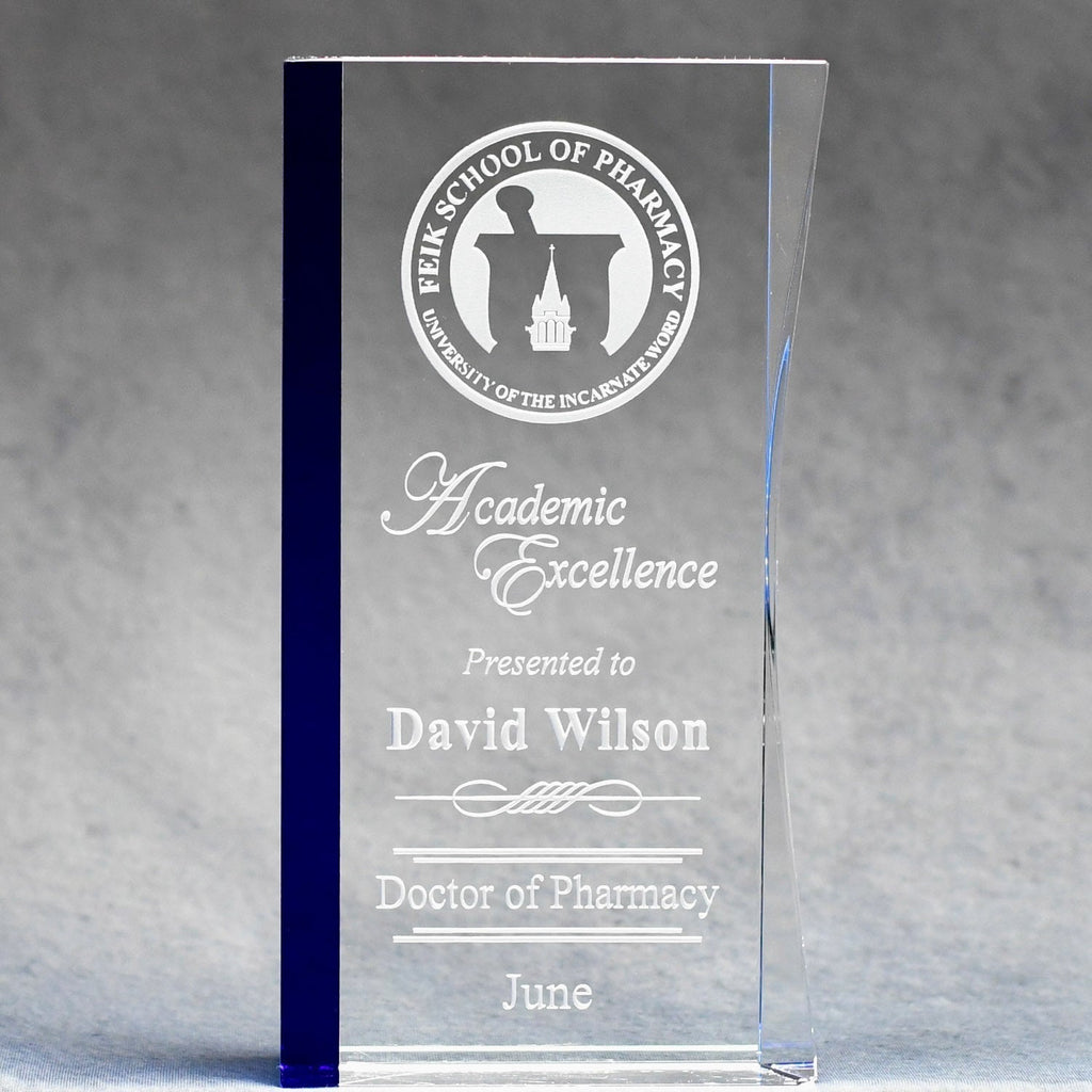 The blue highlights incorporated in this crystal piece are stunning! With ample room for personalization this award is sure to convey honor to the recipient who has excelled in their endeavors. Available in 2 sizes.