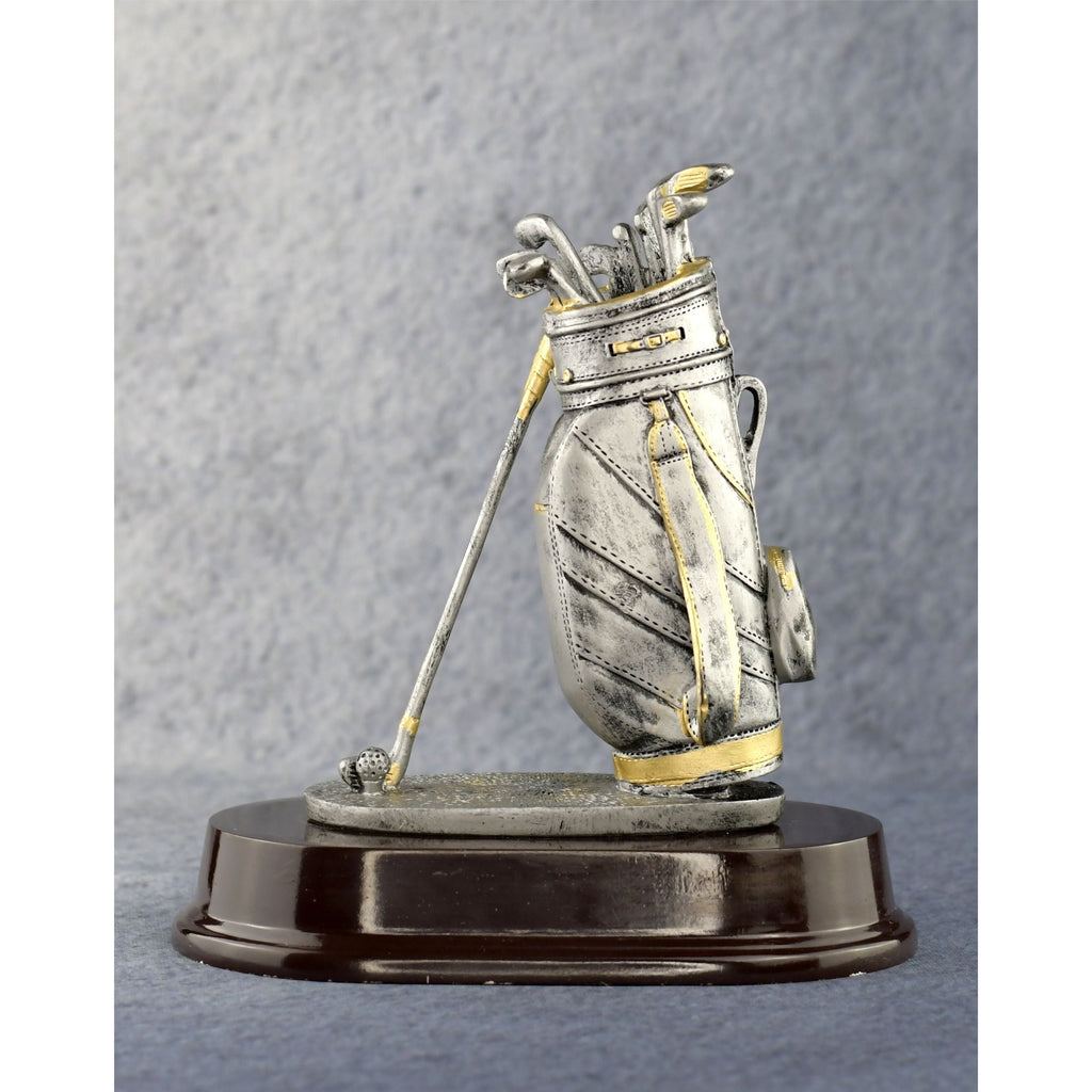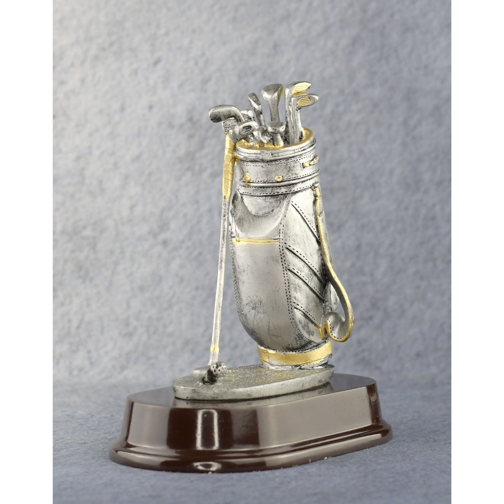 Celebrate golf success with the tools of the trade, a golf bag and clubs. Hand-crafted, 7 inch pewter-finished resin figurine with gold highlights provides something completely different for your upcoming golf event. The lifelike golf bag with clubs is set on an elegant mahogany base with a personalization plate. One of our Best Selling golf awards.