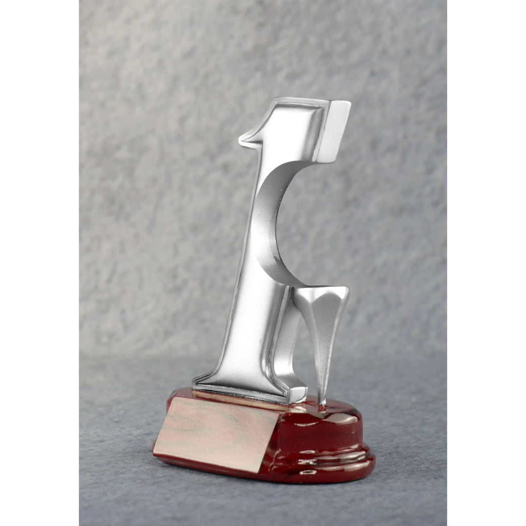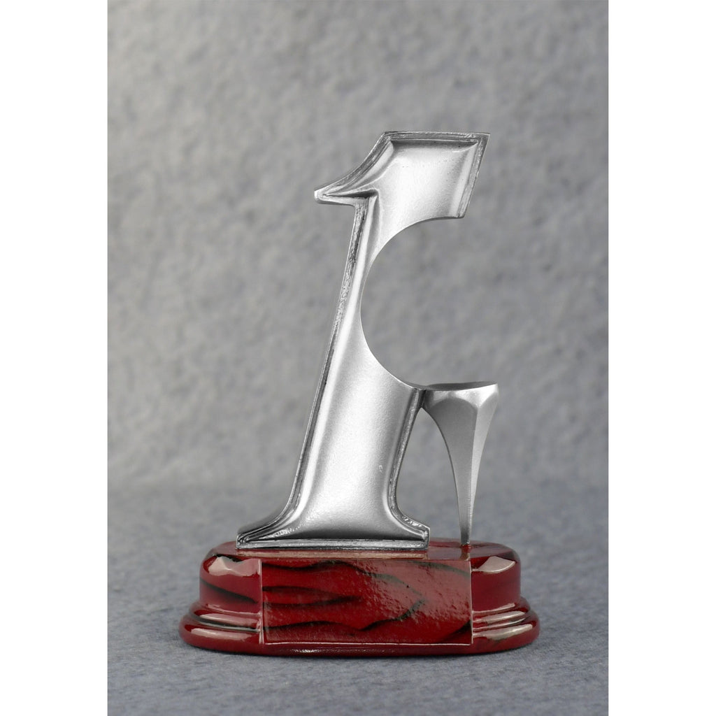A beautiful resin statue to celebrate the ultimate achievement in golf, the Hole-In-One. This 7-inch tall Number 1 has a hole offset over a golf tee. The tee holds the ball used in the winning shot. The award has a pewter finish on a mahogany base. They include a plate for the details of the fabulous event.
