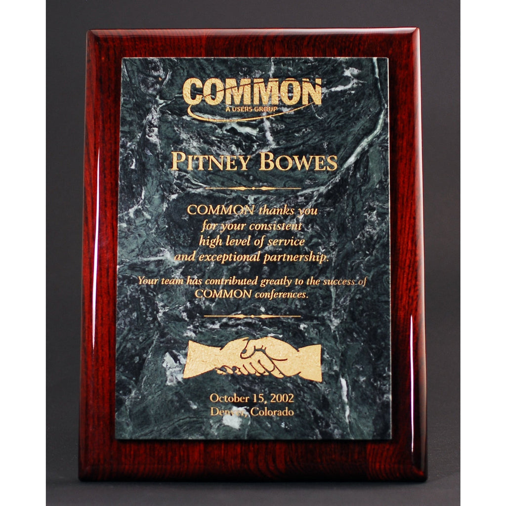 A contemporary classic award featuring a glossy Rosewood Plaque with a rich Green Marble Panel that is etched and color-filled to acknowledge the best in your organization. A stunning way to honor the Employee of the Month or Employee of the Year. Add custom text to create the perfect presentation gift to recognize significant donations to your cause. Include your company logo to honor a life-time of service. Let us help you bring your vision to life!