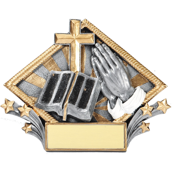 3D silverstone religion them resin with gold accents. This 6" high resin can either hang on wall or stand upright. Lettered plate can be attached to the resin.