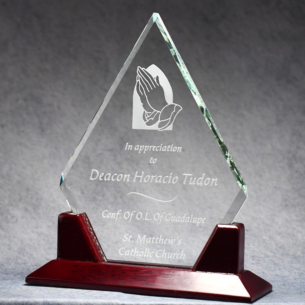A Clear Crystal Simplex Diamond is set into a Piano Finished Rosewood base. Sharp, bright and multi-faceted, clear crystal reflects all those achievements in performance. Etched personalization states the stellar accomplishments to be recognized for years to come!