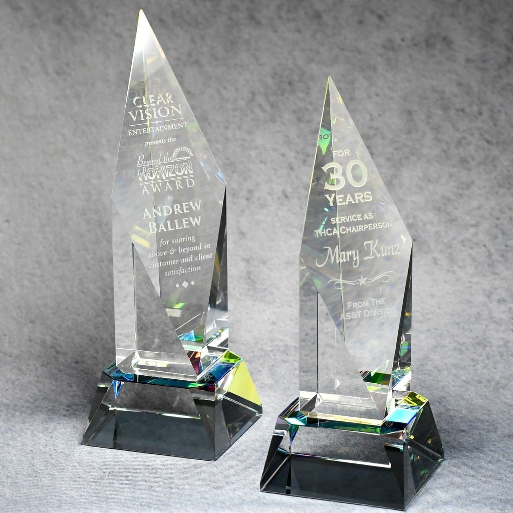 Available in 2 sizes this dazzling and colorful pinnacle of excellence explodes with spectra dichroic mirrored color. The most discriminating award winner will fall in love with its sharp lines and fine detail. The solid pyramid base and angle cut column offer multiple etching surfaces to hold your personalized message.