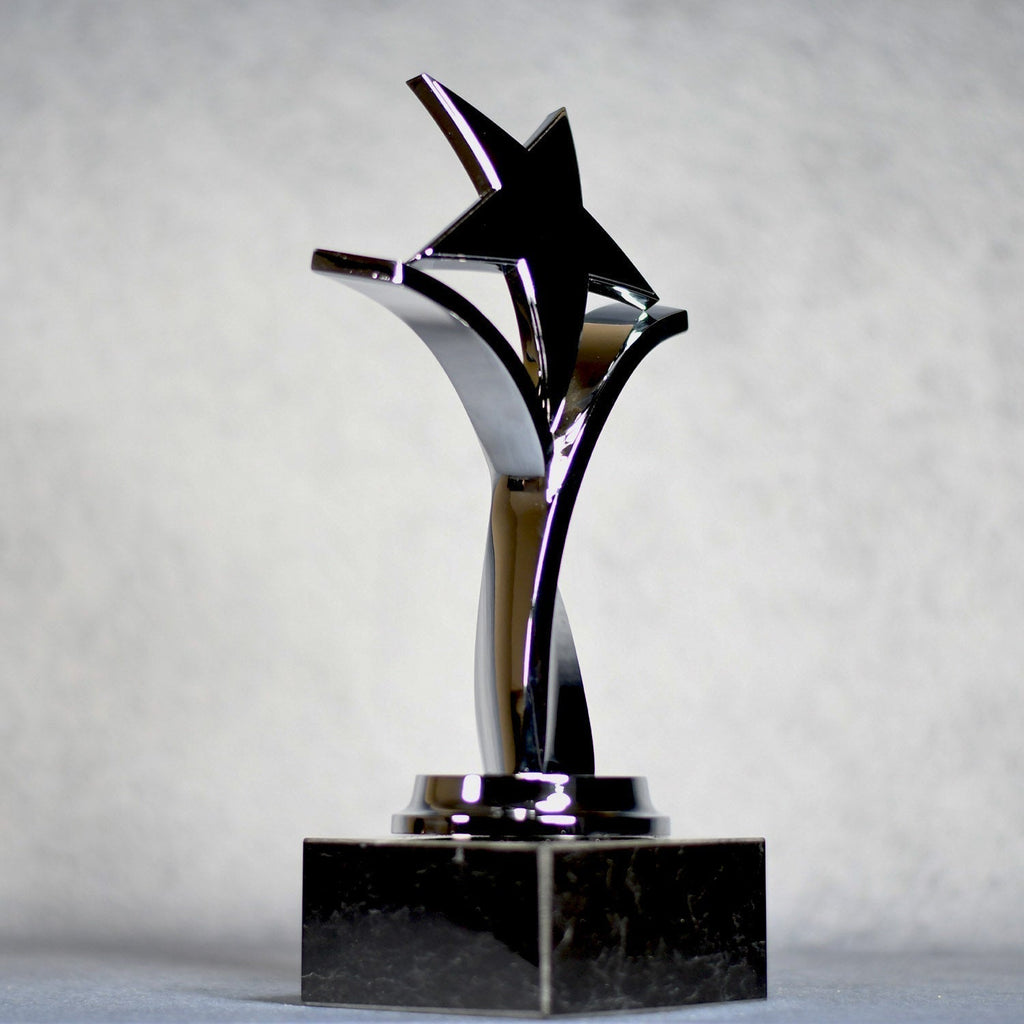 The Twisting Star on Black Marble Base stretches to new heights. The soaring cast metal figure conveys reaching for new goals and achieving them. The black marble base adds to the heft of the piece, communicating the weighty impact of accomplishments. Recognize your recipient for meaningful contributions and encourage others to likewise reach for the stars. Imprint your word of gratitude on a handsome metal plate attached to the base.