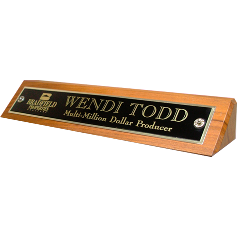 Recognition can mean many things. Solid walnut with two-tone gold plates that hold your name and/or title. It can be one color imprint as shown for an elegant office environment or printed in full-color for total corporate recognition.