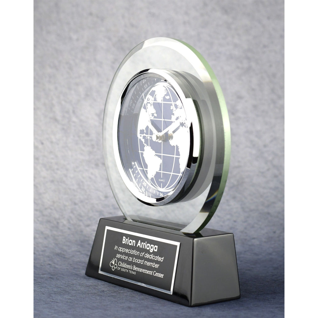 This glass clock has a world dial with a silver bezel on a black high gloss base. Individually gift boxed. Clock movements are guaranteed for life. Battery operated three-hand movement clock. The base has an aluminum plate that can be imprinted with your unique message, company logo, and the individual's name.