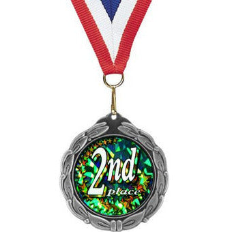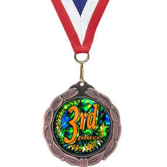 Wreath Style Die-Cast Medal. Your choice of Antiqued Gold, Silver, and Bronze finish. Available with FREE presentation ribbon with your choice of colors below. Select from a multitude of contemporary and colorful activity Mylar inserts. A GREAT economical participation award!